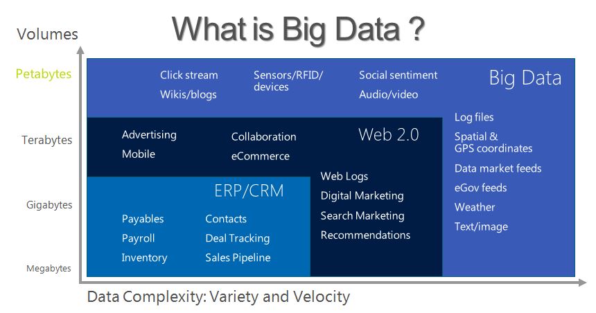 On parle de Big Data puisqu’on assiste à une augmentation à un niveau très élevé vers trois fronts distincts: les 3 V de Volume, Variété et Vitesse!